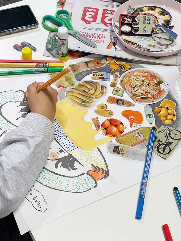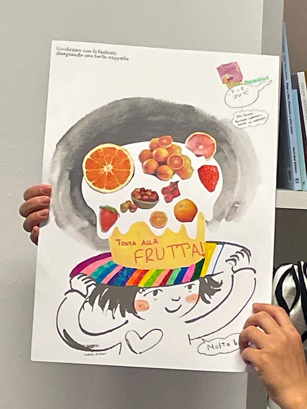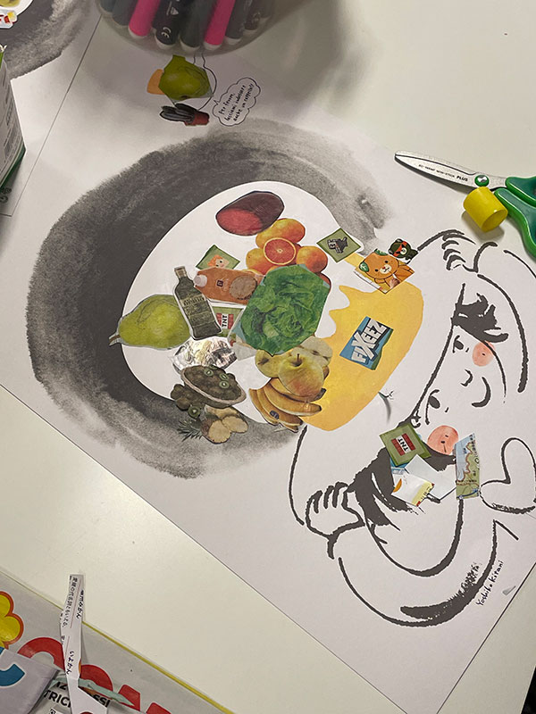 作者による『夜のおたんじょう会へ』の読み聞かせのあと、絵本に登場するような「ケーキぼうし」をコラージュ技法で作ります。ワークショップでできた作品は「こども本の森 松山」の入口に12月25日(木)まで展示する予定です。